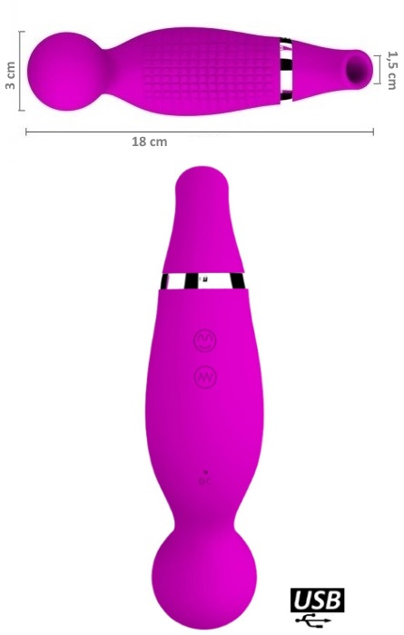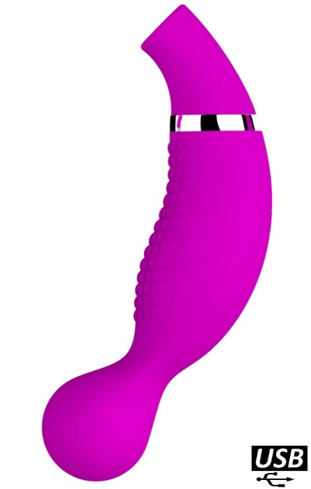 Estimulador feminino com 12 modos de sucção, possui um bocal sugador na parte superior que se encaixa ao clitóris ou nos mamilos, na outra ponta um vibrador massajador com 12 modos de vibração.